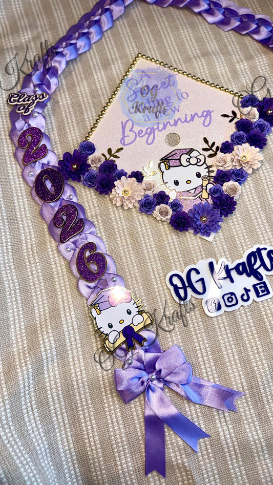 Kitty Graduation Topper Lei Bundle Personalized Grad Cap Graduation Lei Class of 2026 Graduation Topper kitty Topper and Lei Purple Grad