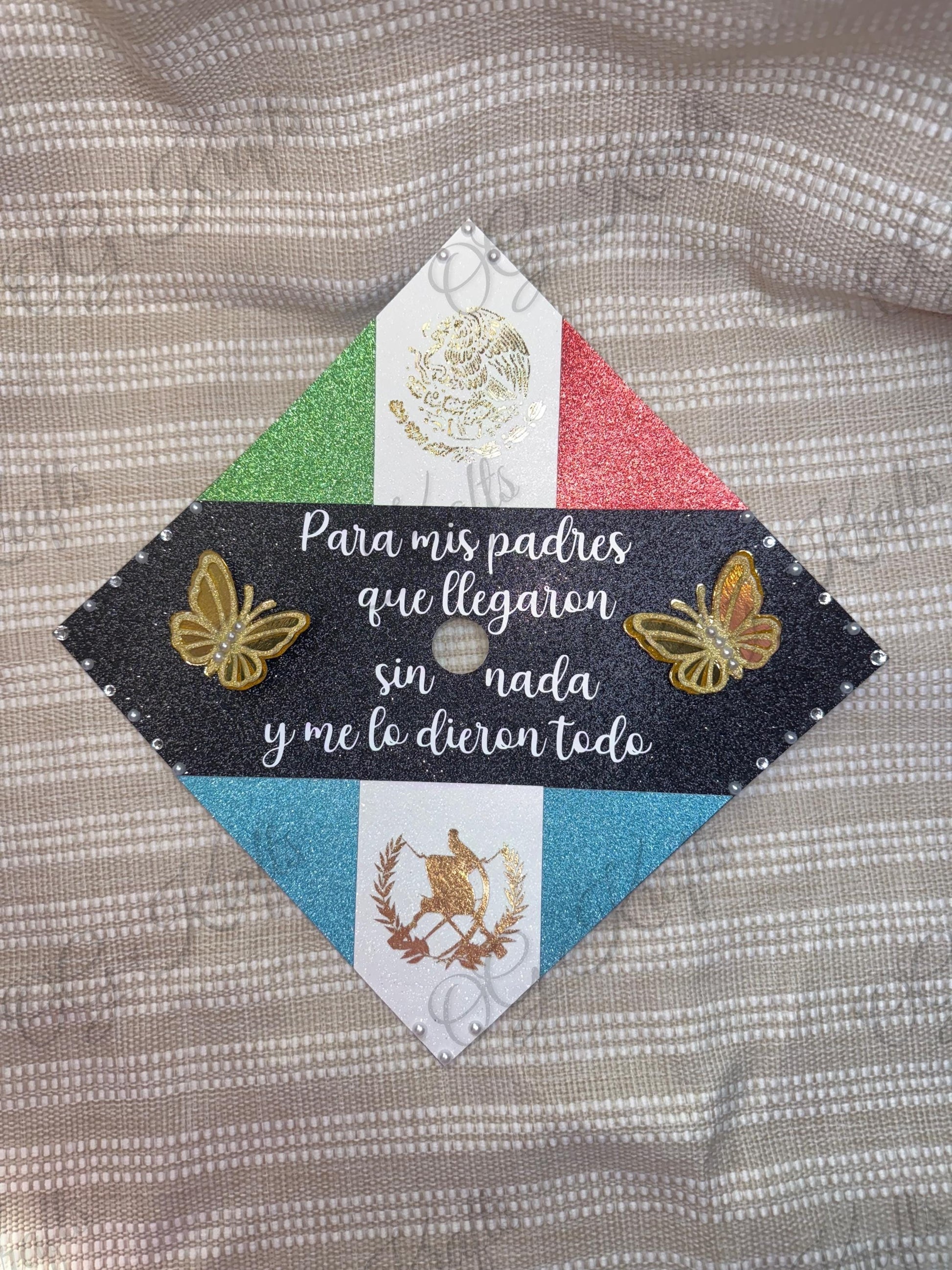 Graduation Cap Topper | Class of 2026 | Mexican & Guatemalan Flags | Gold Butterflies & Paper Flowers