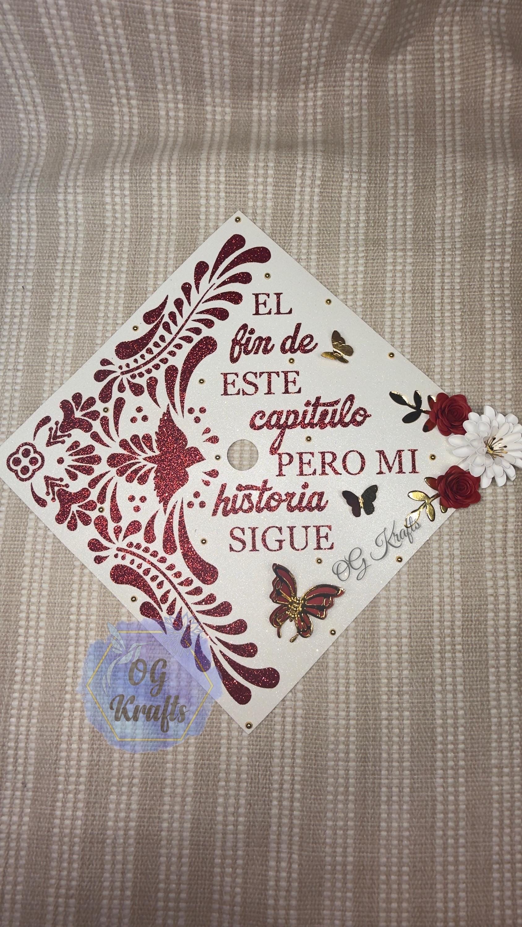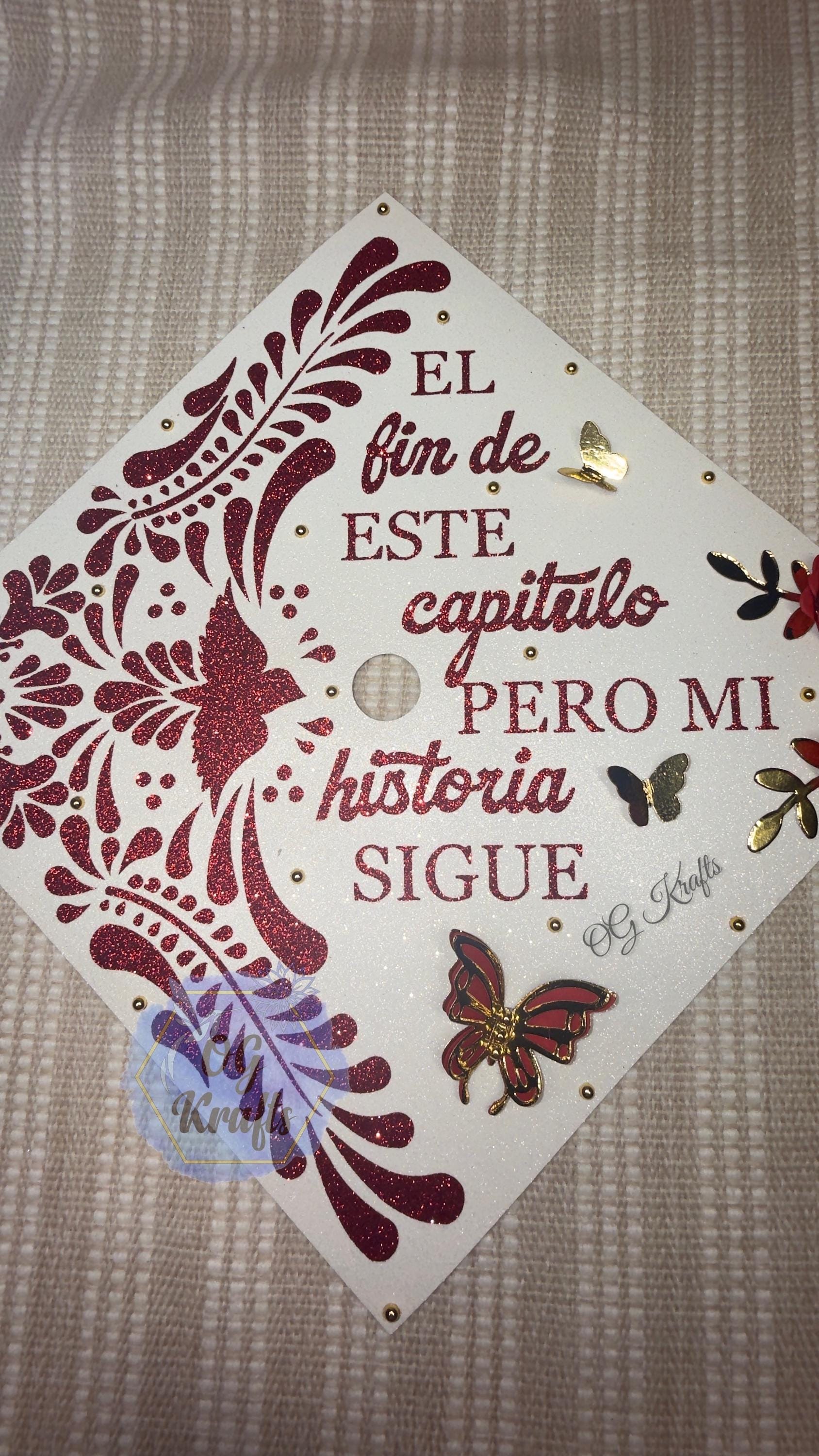 Celebrate your graduation in style with this handcrafted Talavera Graduation Cap Topper, featuring vibrant butterflies and hand-rolled paper flowers. Made with Glitter HTV on thick glittered cardstock, this topper adds a festive and personalized touch to your big day.